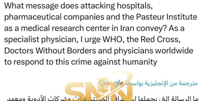 بزشكيان : ‏ما الرسالة التي يحملها استهداف المستشفيات وشركات الأدوية ومعهد باستور كمركز أبحاث طبية في إيران؟ بصفتي طبيباً متخصصاً، أناشد منظمة الصحة العالمية والصليب الأحمر وأطباء بلا حدود والأطباء في جميع أنحاء العالم التصدي لهذه الجريمة ضد الإنسانية.