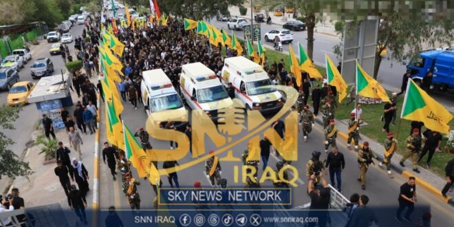 وفي الطرف الآخر، شهد شارع فلسطين في جانب الرصافة من العاصمة موكب تشييع لثلاثة مقاتلين من كتائب حزب الله قضوا بقصف في محافظة البصرة أمس الثلاثاء، حيث وثقت كاميرا وكالة SNN، لحظات حزن ودموع المشيعين.