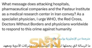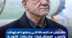 بصفتي طبيباً متخصصاً، أناشد منظمة الصحة العالمية والصليب الأحمر وأطباء بلا حدود والأطباء في جميع أنحاء العالم التصدي لهذه الجريمة ضد الإنسانية. بزشكيان : ما الرسالة التي يحملها استهداف المستشفيات وشركات الأدوية ومعهد باستور كمركز أبحاث طبية في إيران؟ بصفتي طبيباً متخصصاً، أناشد منظمة الصحة العالمية والصليب الأحمر وأطباء بلا …